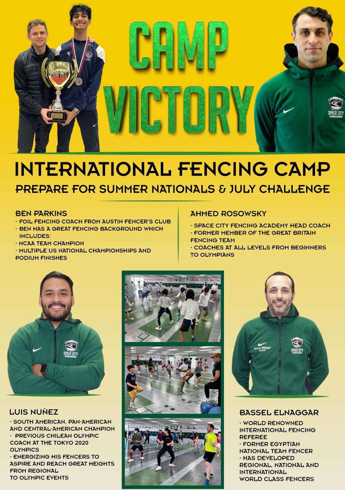Coach Ben Parkins along with our world class coaching staff to get ready for Summer Nationals! Camp Victory has helped many fencers in previous years to sharpen and improve their skills and abilities to achieve their best results at Summer Nationals!